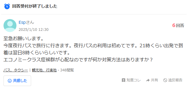 エコノミークラス症候群が心配なのですが何か対策方法はありますか?引用:ヤフー知恵袋