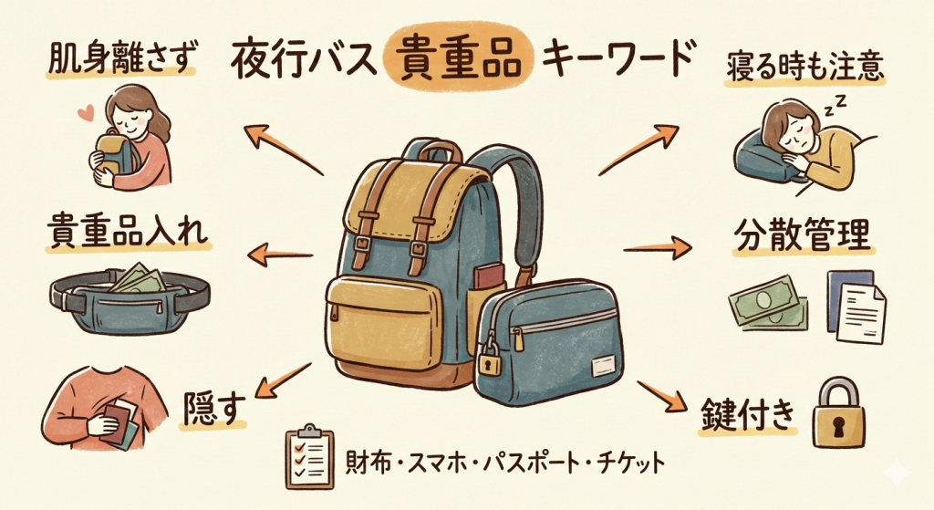 初めての一人旅、貴重品の管理、本当に怖いですよね。その不安、非常によくわかります。決して「考えすぎ」ではありません。夜行バスの消灯後は、残念ながら犯罪者にとって好都合な環境です。