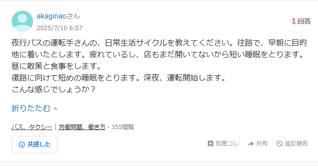 夜行バスの運転手さんの、日常生活サイクルを教えてください。往路で、早朝に目的地に着いたとします。疲れているし、店もまだ開いてないから短い睡眠をとります。昼に散策と食事をします。